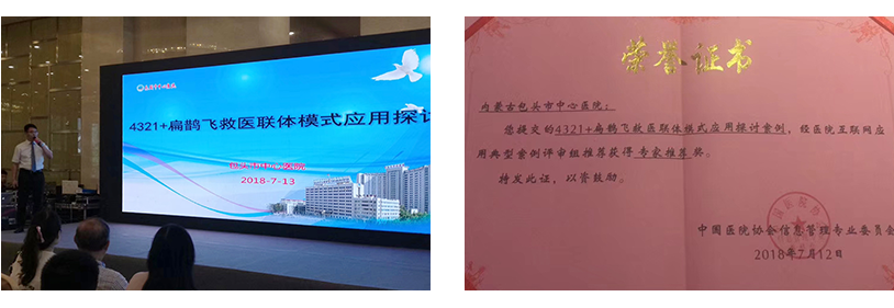 在2018年7月的中国医院协会信息网络大会暨中外医疗信息网络技术和软件产品展览会(CHIMA 2018)上,「4321+扁鹊飞救医联体模式应用探讨案例」经医院互联网应用典型案例评审组推荐荣获「专家推荐奖」 。