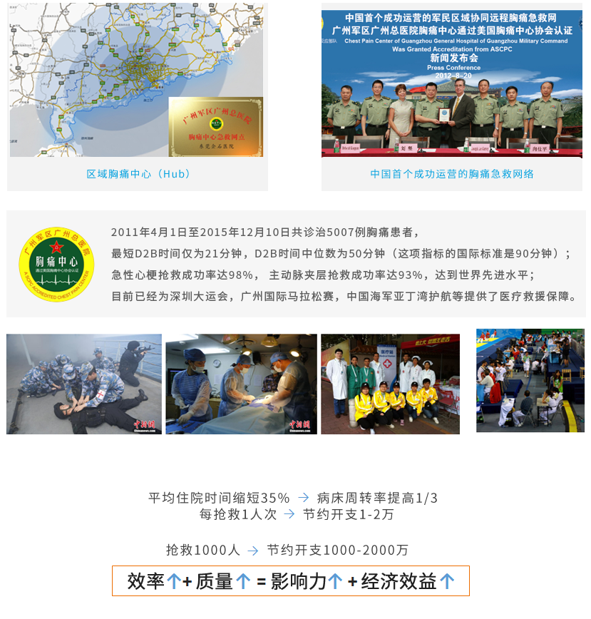 中国人民解放军南部战区总医院(原广州军区广州总医院)2011年成立中国首家胸痛中心,建立了中国首个成功运营的军民区域协同远程胸痛急救网作为国内胸痛中心的试点,我们根据美国胸痛中心国际认证的要求,结合当地和医院的特点,助力其建立了南部战区总医院胸痛中心模式。