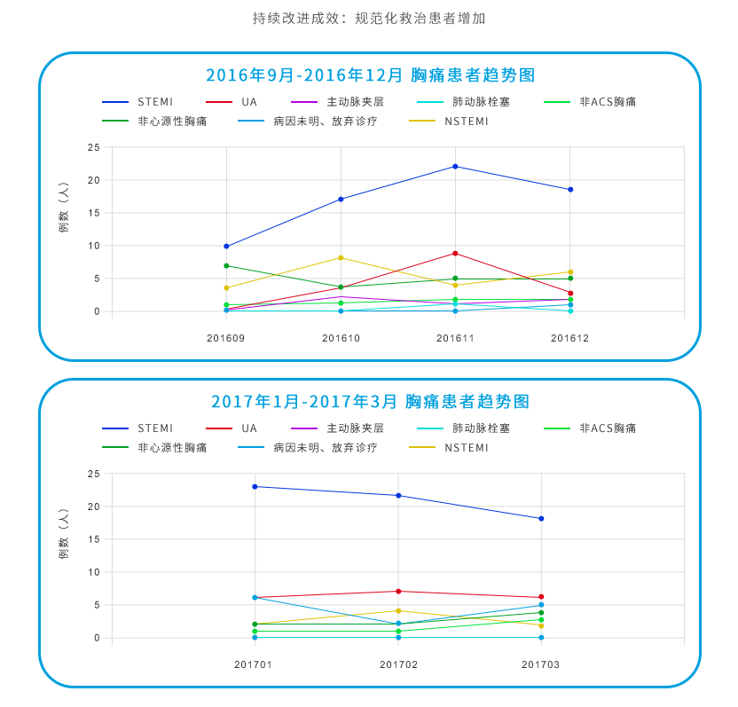 医院还利用扁鹊飞救®系统建立了胸痛患者的数据库,包括院前院内救治各个环节的时间点及救治过程,提现了整体救治,为质控和改进提供了有力的数据支持。建立患者档案、设立随访中心、随访门诊、定期安排随访不仅让患者在医院得到有效治疗,还注重患者的长期治疗,随时调整治疗方案,改善远期疗效。